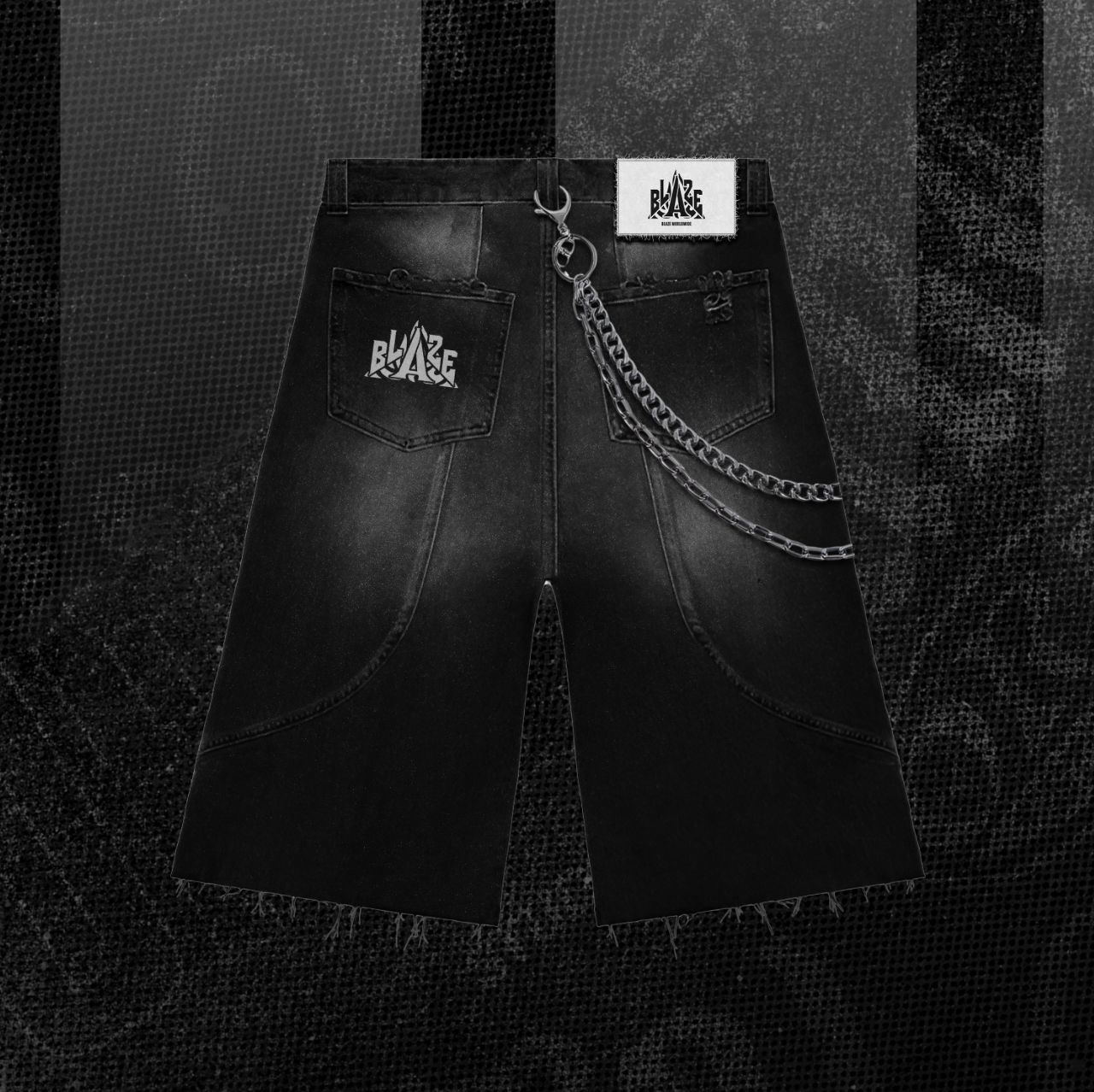 Faith-based shorts with crucifix graphics, ripped textures, and Blaze embroidery.